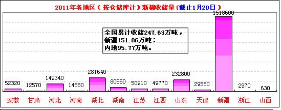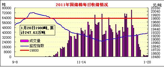 1月20日春節(jié)前最后一個交儲日,計劃收儲120200噸,實際成交1980噸,成交比例1.6%。新疆庫點連續(xù)6日保持零成交;內(nèi)地庫計劃收儲83200噸,實際成交1980噸,成交率2.3%。截止今日2011年度棉花臨時收儲累計成交2476260噸,新疆累計成交1518600噸,內(nèi)地累計成交957660噸。