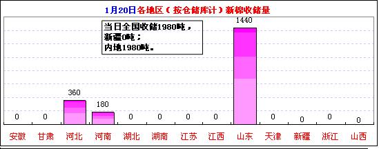 按倉儲庫收儲匯總:當日山東庫收儲1440噸,河北360噸,河南180噸。截止1月20日,新疆庫累計收儲151.86萬噸,占61.3%、湖北28.16萬噸,占11.4%;山東23.28萬噸,占9.4%、河北14.93萬噸,占6.0%、湖南80550噸,占3.3%等。