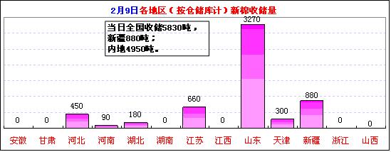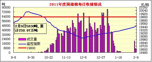2月9日計(jì)劃收儲(chǔ)100240噸,實(shí)際成交5830噸,成交比例5.8%。其中新疆庫(kù)點(diǎn)計(jì)劃收儲(chǔ)24800噸,實(shí)際成交880噸,成交比例3.5%;內(nèi)地庫(kù)計(jì)劃收儲(chǔ)75440噸,實(shí)際成交4950噸,成交率6.5%。截止今日2011年度棉花臨時(shí)收儲(chǔ)累計(jì)成交2509690噸,新疆累計(jì)成交1520080噸,內(nèi)地累計(jì)成交989610噸。