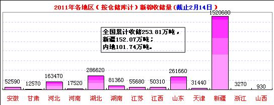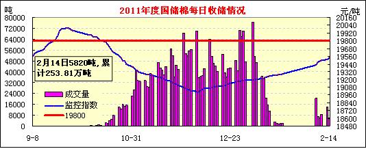 2月14日計劃收儲100100噸,實際成交5820噸,成交比例5.8%。其中新疆庫點計劃收儲24800噸,全部流拍;內(nèi)地庫計劃收儲75300噸,實際成交5820噸,成交率7.7%。截止今日2011年度棉花臨時收儲累計成交2538100噸,新疆累計成交1520680噸,內(nèi)地累計成交1017420噸。
