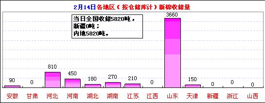 按倉儲庫收儲地區(qū)匯總:當日山東庫收儲3660噸,占62.9%,河北810噸,占13.9%,新疆0噸等。截止2月14日,新疆庫累計收儲152.07萬噸,占59.9%、湖北28.66萬噸,占11.3%;山東26.17萬噸,占10.3%、河北16.34萬噸,占6.4%、湖南81360噸,占3.2%等。
