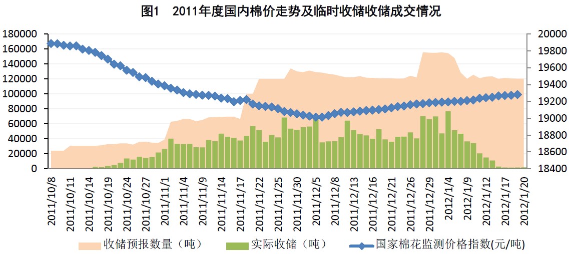 另外,截止1月20日,國家累計收儲2011年度國產(chǎn)棉247.626萬噸,雖然明顯改善了國內(nèi)棉市的供求關(guān)系,但是尚不能對國內(nèi)棉市產(chǎn)生決定性的影響。1月16-20日一周,國內(nèi)收儲累計成交不足前一周收儲成交量的1/10。若期棉價格繼續(xù)上漲,交儲的吸引力將繼續(xù)下降,收儲對市場的支撐作用將明顯減弱。