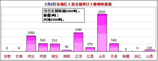 2月8日計劃收儲100120噸,實際成交6900噸,成交比例6.89%。其中新疆庫點無成交;內(nèi)地庫計劃收儲75320噸,實際成交6900噸,成交率9%。截止今日2011年度棉花臨時收儲累計成交2503860噸,新疆累計成交1519200噸,內(nèi)地累計成交984660噸。
