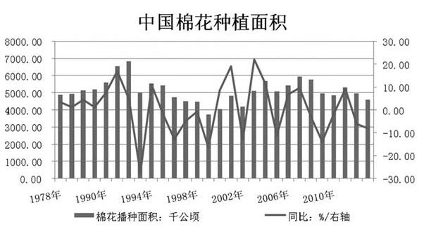 據(jù)國際棉花咨詢委員會預測,中國2013年棉花種植面積為460萬公頃,同比減少8%,創(chuàng)2003年以來最低水平,總產量約為610萬噸,同比減少11%。此預測數(shù)據(jù)與去年11月底國家棉花市場監(jiān)測系統(tǒng)對國內棉花意向種植調查報告數(shù)據(jù)基本吻合。分析認為,棉花種植效益下降,相對收益波動較大以及勞動力投入不足等因素是棉花意向種植面積減少的主因。棉花種植面積減少,對新年度棉價或將產生利多效應。