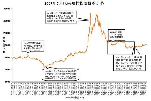 如果將美國2008年以來的三輪QE政策用事件坐標(biāo)標(biāo)注在鄭棉指數(shù)走勢圖上,棉價上漲的資金推動效應(yīng)和棉價下跌的資金擠出效應(yīng)再明顯不過了。只有將棉花的自然屬性跟金融屬性一起分析,才能準(zhǔn)確描述棉市的價格運動。本文主要以美國2008年金融危機以來的三輪QE政策為時間軸,簡要梳理鄭棉這幾年的走勢及其成因。