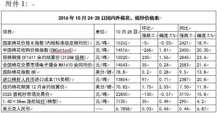 本周,新棉收購價(jià)格小幅回落、皮棉現(xiàn)貨價(jià)格弱勢(shì)平穩(wěn),鄭棉期價(jià)振蕩上行。10月28日,內(nèi)地標(biāo)準(zhǔn)級(jí)皮棉銷售均價(jià)15262元/噸,較上周下跌5元/噸,降幅0.03%,同比上漲2421元/噸,漲幅18.9%。全國棉花交易市場(chǎng)電子撮合交易11月合同均價(jià)14543元/噸,較上周上漲35元/噸,上漲0.24%,同比上漲2583元/噸,漲幅21.6%。鄭州棉花期貨11月合約結(jié)算價(jià)15020元/噸,較上周上漲230元/噸,漲幅1.56%,同比上漲2845元/噸,漲幅23.4%。國內(nèi)3級(jí)籽棉收購均價(jià)3.63元/斤(折皮棉14516元/噸),較上周下跌0.06元/斤(折皮棉下跌268元/噸),跌幅1.63%,同比上漲0.81元/斤(折皮棉2450元/噸),漲幅28.72%。其中,內(nèi)地籽棉收購均價(jià)3.66元/斤(折皮棉14394元/噸),較上周下跌0.01元/斤(折皮棉下跌100元/噸),跌幅0.27%,同比上漲0.62元/斤(折皮棉2074元/噸),漲幅20.39%;新疆籽棉收購均價(jià)3.62元/斤(折皮棉14565元/噸),較上周下跌0.08元/斤(折皮棉下跌337元/噸),跌幅2.16%,同比上漲0.92元/斤(折皮棉上漲3121元/噸),漲幅34.07%。