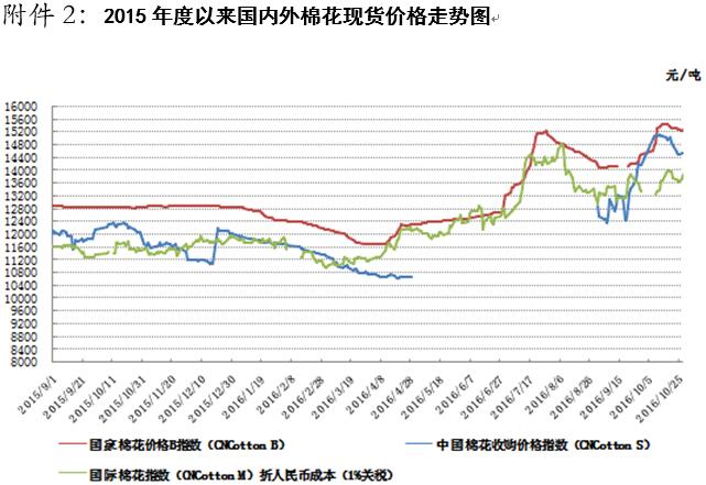 本周,10月28日,紐約棉花期貨12月合約結(jié)算價(jià)70.82美分/磅,較上周上漲1.75美分/磅,漲幅2.53%。代表進(jìn)口棉中國主港到岸均價(jià)的國際棉花指數(shù)(M)按1%關(guān)稅計(jì)算,折人民幣進(jìn)口成本13854元/噸,較上周上漲97元/噸,漲幅0.71%,低于國內(nèi)市場(chǎng)1408元/噸,價(jià)差較上周收窄276元/噸。