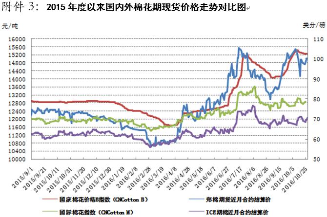 國際棉價(jià)短期內(nèi)偏強(qiáng)振蕩。宏觀方面,10月24日美國圣路易斯聯(lián)儲(chǔ)主席布拉德表示,今年12月會(huì)議是最有可能的加息節(jié)點(diǎn)。不過,美國利率水平可能將在數(shù)年時(shí)間里保持在非常低的水平上。10月28日美國商務(wù)部公布的數(shù)據(jù)顯示,美國三季度實(shí)際GDP年化季環(huán)比初值增2.9%,升幅創(chuàng)2014年第三季度以來最大,且高于預(yù)期。