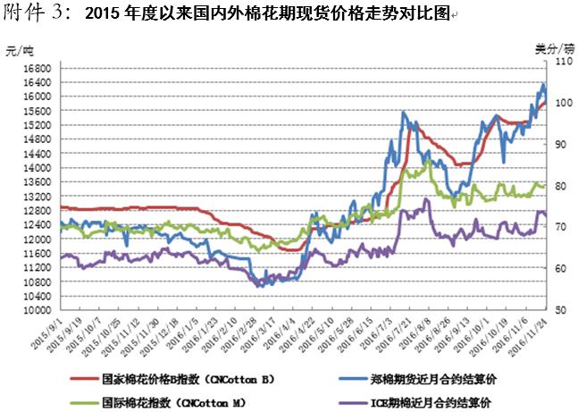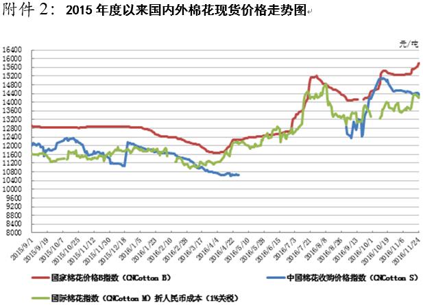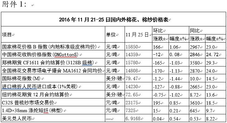 本周,國內(nèi)棉花現(xiàn)貨價格穩(wěn)中略漲,期貨價格略有回落。11月25日,內(nèi)地標準級皮棉銷售均價15850元/噸,較上周上漲166元/噸,漲幅1.06%,同比上漲2967元/噸,漲幅23%。全國棉花交易市場電子撮合交易12月合同均價14808元/噸,較上周下跌170元/噸,降幅1.13%,同比上漲2870元/噸,漲幅24%。鄭州棉花期貨CF1701合約結(jié)算價15780元/噸,較上周下降165元/噸,降幅1.03%,同比上漲3580元/噸,漲幅29.3%。國內(nèi)3級籽棉收購均價3.64元/斤(折皮棉14359元/噸),較上周上漲0.01元/斤,漲幅0.28%,同比上漲0.88元/斤,漲幅31.88%。內(nèi)地籽棉收購均價3.7元/斤(折皮棉14463元/噸),較上周持平,同比上漲0.71元/斤,漲幅23.75%;新疆籽棉收購均價3.6元/斤(折皮棉14313元/噸),較上周持平,同比上漲0.94元/斤,漲幅35.34%。