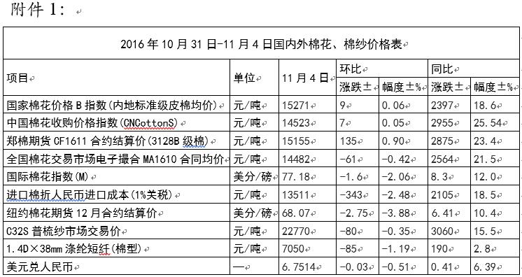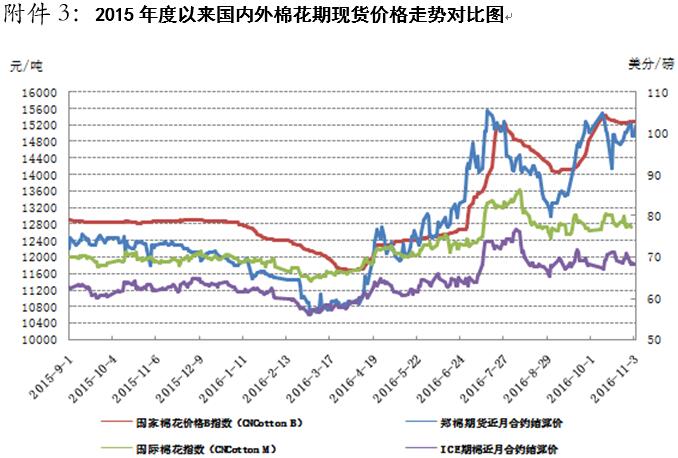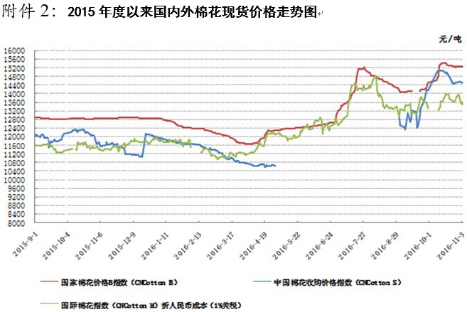 國內(nèi)棉價短期內(nèi)走勢仍偏強。宏觀方面,據(jù)國家統(tǒng)計局最新數(shù)據(jù)顯示,2016年10月中國制造業(yè)采購經(jīng)理指數(shù)(PMI)為51.2%,比上月上升0.8個百分點,在臨界點之上明顯回升。從分類指數(shù)看,生產(chǎn)指數(shù)為53.3%,比上月上升0.5個百分點,表明制造業(yè)生產(chǎn)保持較快增長;新訂單指數(shù)為52.8%,比上月上升1.9個百分點,表明制造業(yè)市場需求增速有所加快;原材料庫存指數(shù)為48.1%,比上月回升0.7個百分點,表明制造業(yè)主要原材料庫存量收縮幅度有所減小。