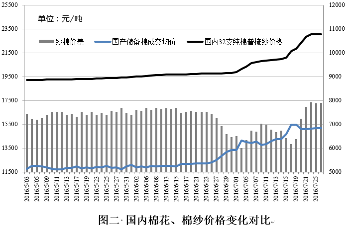 從國內(nèi)看,經(jīng)過6月底以來的快速上漲和補漲,到7月下旬,儲備棉成交均價與32支純棉普梳棉紗價差再次回升至7000-8000元/噸左右的近年較高水平。從國際看,4月以來國產(chǎn)32支純棉普梳紗與印度、巴基斯坦同檔次棉紗價格的對比關系也發(fā)生改變,印巴紗已上漲至國產(chǎn)紗價以上,同檔次國產(chǎn)棉紗已占據(jù)價格競爭優(yōu)勢。