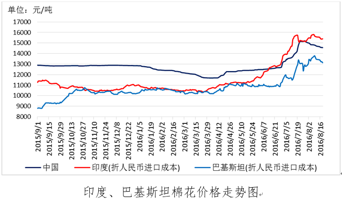 2016年8月15-19日,國(guó)內(nèi)32支普梳純棉紗周均價(jià)22352元/噸,環(huán)比上漲2元/噸;印度國(guó)內(nèi)30支普梳純棉紗周均價(jià)3美元/公斤,環(huán)比上漲0.1美元/公斤,漲幅3.5%,折人民幣進(jìn)口成本24720元/噸,較國(guó)內(nèi)32支普梳純棉紗高2368元/噸;巴基斯坦國(guó)內(nèi)30支普梳純棉紗周均價(jià)3.09美元/公斤,環(huán)比下跌0.05美元/公斤,跌幅1.6%,折人民幣進(jìn)口成本25450元/噸,較國(guó)內(nèi)32支普梳純棉紗高3098元/噸。