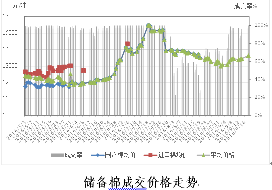 儲(chǔ)備棉出庫(kù)價(jià)格企穩(wěn)上漲。9月份,儲(chǔ)備棉出庫(kù)成交均價(jià)繼續(xù)下跌,但9月中下旬開(kāi)始,紡織企業(yè)加大了競(jìng)拍力度,以備新棉上市前使用,儲(chǔ)備棉成交價(jià)企穩(wěn)回升,成交率更是快速恢復(fù)。9月以來(lái)截止9月19日,出庫(kù)成交均價(jià)為13370元/噸,較8月均價(jià)下跌265元/噸,9月以來(lái)出庫(kù)平均成交率為88.32%,較8月平均成交率回升27.37個(gè)百分點(diǎn)。截至9月19日,累計(jì)計(jì)劃出庫(kù)269.47萬(wàn)噸,累計(jì)出庫(kù)成交235.29萬(wàn)噸,成交率為87.32%,其中國(guó)產(chǎn)棉累計(jì)成交205.66萬(wàn)噸,成交率85.95%;進(jìn)口棉累計(jì)成交29.63萬(wàn)噸,成交率98.16%。累計(jì)成交平均長(zhǎng)度為28.3mm,最高成交價(jià)16490元/噸,最低成交價(jià)9730元/噸,折3128價(jià)格14590元/噸,成交平均價(jià)格為13213元/噸,累計(jì)成交884家。