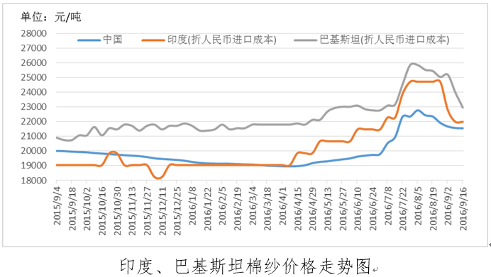 2016年9月13-16日,國(guó)內(nèi)32支普梳純棉紗周均價(jià)21555,22352元/噸,環(huán)比下跌797元/噸,跌幅3.6%;印度國(guó)內(nèi)30支普梳純棉紗周均價(jià)2.7美元/公斤,環(huán)比下跌0.3美元/公斤,跌幅10.0%,折人民幣進(jìn)口成本21997元/噸,較國(guó)內(nèi)32支普梳純棉紗高442元/噸;巴基斯坦國(guó)內(nèi)30支普梳純棉紗周均價(jià)2.953.09美元/公斤,環(huán)比下跌0.14美元/公斤,跌幅4.5%,折人民幣進(jìn)口成本22957元/噸,較國(guó)內(nèi)32支普梳純棉紗高1402元/噸。