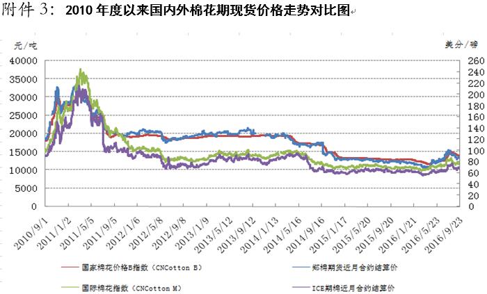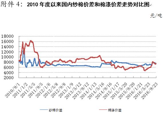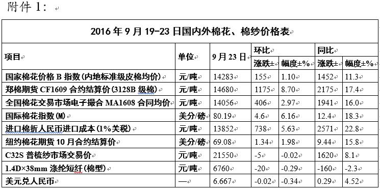 基本面方面,9月19-23日,中國儲(chǔ)備棉管理總公司計(jì)劃出庫銷售儲(chǔ)備棉14.58萬噸,實(shí)際成交14.58萬噸,全部為國產(chǎn)棉,成交率100%。截至2016年9月23日,2015/2016年度儲(chǔ)備棉累計(jì)出庫成交246.25萬噸,其中國產(chǎn)棉成交216.64萬噸,進(jìn)口棉成交29.61萬噸。
