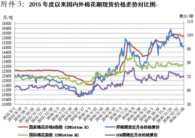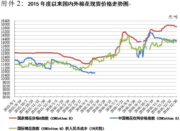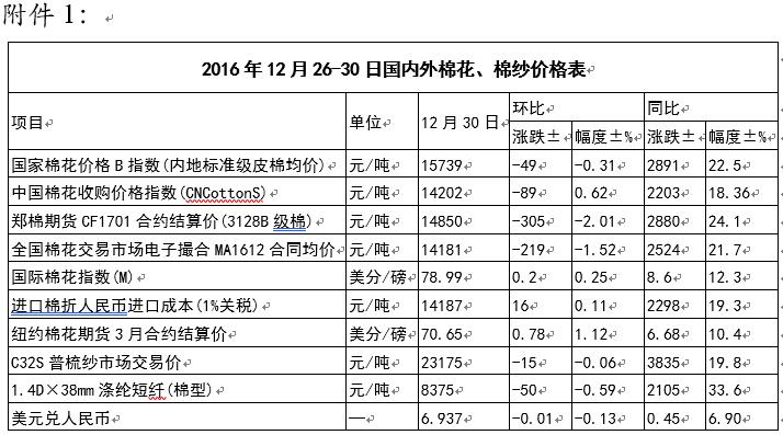 本周,國內(nèi)棉花現(xiàn)貨價(jià)格持續(xù)弱勢(shì),鄭棉價(jià)格大幅下挫后振蕩回升。12月30日,內(nèi)地標(biāo)準(zhǔn)級(jí)皮棉銷售均價(jià)15739元/噸,較上周下跌49元/噸,跌幅0.31%,同比上漲2891元/噸,漲幅22.5%。全國棉花交易市場電子撮合交易1月合同均價(jià)14181元/噸,較上周下跌219元/噸,跌幅1.52%,同比上漲2524元/噸,漲幅21.7%。鄭州棉花期貨CF1701合約結(jié)算價(jià)14850元/噸,較上周下跌305元/噸,跌幅2.01%,同比上漲2880元/噸,漲幅24.1%。