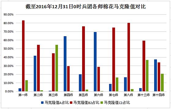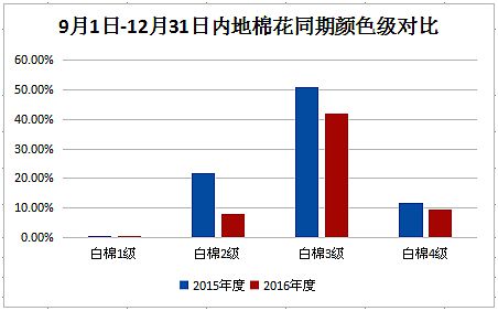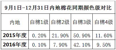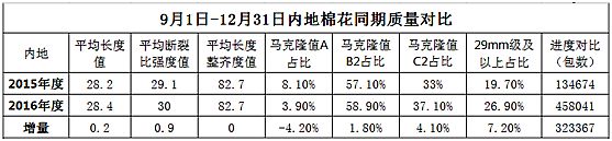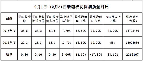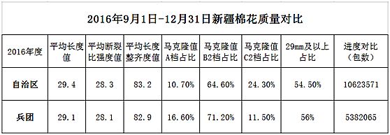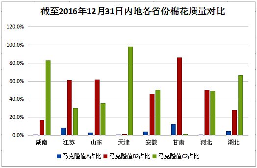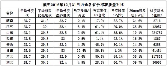 本周,內(nèi)地加工基本停止,新疆皮棉日加工量驟減。據(jù)全國(guó)棉花加工檢驗(yàn)數(shù)據(jù)平臺(tái)統(tǒng)計(jì),內(nèi)地棉花較上年成熟度有提高,29mm及以上的占比有增加,顏色級(jí)表現(xiàn)稍差,分省來(lái)看,天津、湖南、湖北馬值表現(xiàn)較差,甘肅、山東、江蘇馬值表現(xiàn)相對(duì)較好。截至2016年12月31日,新疆皮棉累計(jì)加工量為381.04萬(wàn)噸,日加工量由周初的1.88萬(wàn)噸降至1.14萬(wàn)噸。