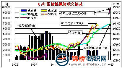 11月23日計劃拋售2006、2007年度儲備棉16084噸,全部成交;平均等級3.79,較昨上一日高0.05,平均長度29.03,較上一日高0.07;加權成交價15320元/噸,較上一日漲346元,折328級成交價為15524元/噸,較上一日漲314元。當日328級均價15507元/噸,漲440元,最高價15620元,最低15340元;329級均價15183元/噸,最高15640元,最低14860元;429級成交均價15327元/噸,漲334元,最高15620元,最低15000元。截止11月23日,累計成功拋售儲備棉2166721噸,其中2008年度儲備棉1507029噸,2003-2007年度棉花659692噸 ;當日有342家交易商參與競賣,有46家企業(yè)最終成交,當日推出資源總捆數81捆,實際成交81捆。