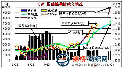 11月24日計劃拋售2006、2007年度儲備棉18124噸,全部成交;平均等級3.85,較昨上一日低0.06,平均長度29.02,較上一日低0.01;加權(quán)成交價15352元/噸,較上一日漲32元,折328級成交價為15585元/噸,較上一日漲61元。其中329級實際成交均價15201元/噸,漲18元,最高15600元,最低14820元;429級均價15395元/噸,漲68元,最高15900元(濱州倉儲庫),最低15160元。截止11月24日,累計成功拋售儲備棉2184845噸,其中2008年度儲備棉1507029噸,2003-2007年度棉花677816噸 ;當(dāng)日有346家交易商參與競賣,有55家企業(yè)最終成交,當(dāng)日推出資源總捆數(shù)89捆,實際成交89捆。