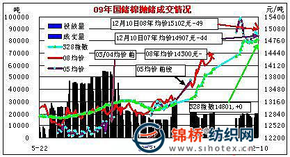 12月10日儲(chǔ)備棉全部交 成交價(jià)繼續(xù)回落 12月10日計(jì)劃拋售2006、2007年度儲(chǔ)備棉7025噸,2008年度儲(chǔ)備棉12988噸,共20012噸,全部成交;平均等級(jí)3.39,平均長度28.91,加權(quán)成交價(jià)15034元/噸,跌42元,折328級(jí)成交價(jià)為15072元/噸,跌97元。其中328級(jí)成交均價(jià)15165元/噸,跌88元,最高價(jià)15440元,最低14900元;主體品級(jí)329級(jí)均價(jià)15060元/噸,跌180元,最高價(jià)15510元,最低14750元;主體品級(jí)429級(jí)均價(jià)14899元/噸,跌97元,最高價(jià)15160元,最低14780元。截止12月10日,第三批累計(jì)成功拋售儲(chǔ)備棉278970噸,其中2008年度儲(chǔ)備棉28568噸,2006、2007年度棉花250403噸 ;當(dāng)日有281家交易商參與競(jìng)賣,有77家企業(yè)最終成交,當(dāng)日推出資源總捆數(shù)118捆,實(shí)際成交118捆。 當(dāng)日成交2006、2007年度儲(chǔ)備棉7025噸,平均等級(jí)3.91,較上一日高0.04;平均長度29.02,與上一日持平;加權(quán)成交價(jià)14907元/噸,較上一日跌44元;折328級(jí)成交價(jià)為15161元/噸,較上一日跌64元。當(dāng)日成交2008年度儲(chǔ)備棉12988噸,平均等級(jí)3.11,較上一日高0.06,平均長度28.85,較上一日高0.21,加權(quán)成交價(jià)15102元/噸,較昨日跌49元,折328級(jí)成交價(jià)為15022元/噸,較昨日跌111元。 當(dāng)日魏橋紡織集團(tuán)成交2337噸,占成交總量的11.7%,成交均價(jià)14853元/噸,漲46元,最高價(jià)14990元,最低14800元;魯棉集團(tuán)天元紡織成交1523噸,均價(jià)15215元/噸,跌265元,最低價(jià)15550元,最低14860元。近幾日來,棉花經(jīng)營企業(yè)參與競(jìng)拍的企業(yè)增多,尤其是旗下所屬紡織企業(yè),競(jìng)拍加價(jià)幅度相對(duì)較高,成交機(jī)率大,紡織企業(yè)尤其是中小型企業(yè)資金實(shí)力不及,成交機(jī)率相對(duì)較低。