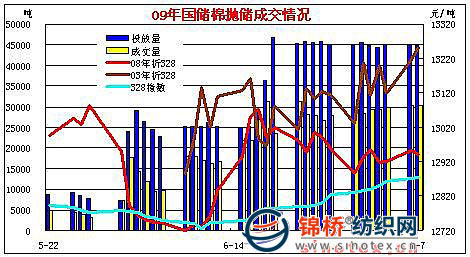 7月7日計(jì)劃拋售儲(chǔ)備棉數(shù)量為44807噸,其中,2003/04年度儲(chǔ)備棉16789噸,2008年度收儲(chǔ)棉28018噸。實(shí)際成交30294噸,其中2003/04年度推出的16789噸計(jì)劃全部成交,2008年度棉花成交13505噸,流拍14513噸。當(dāng)日成交2008年度儲(chǔ)備棉平均等級(jí)3.31,平均長度28.16,加權(quán)成交價(jià)12840元/噸,跌27元,折328級(jí)成交價(jià)為12938元/噸,跌12元;當(dāng)日成交2003年度儲(chǔ)備棉平均等級(jí)4.9,平均長度27.23,加權(quán)成交價(jià)12399元/噸,跌68元,折328級(jí)成交價(jià)為13200元/噸,漲38元。
