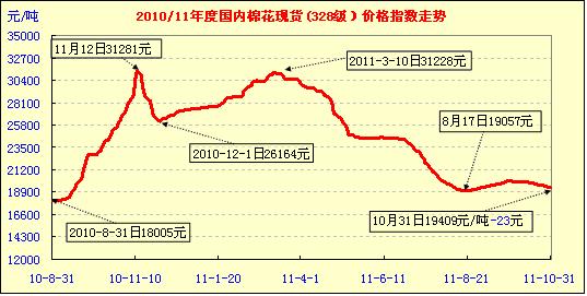 10月份全月棉價(jià)基本呈持續(xù)小幅回落態(tài)勢(shì),全月平均累計(jì)跌幅560元左右,基本抵消了9月份的漲幅(9月份累計(jì)上漲660元左右),棉價(jià)全線跌至收儲(chǔ)價(jià)線以下。在這其中,魏橋紡織自10月15日來(lái)連續(xù)三次下調(diào)采購(gòu)對(duì)棉價(jià)下跌起至摧化劑作用。由于價(jià)格的持續(xù)下跌,10月份的收儲(chǔ)量逐步攀升,由9月份全月收儲(chǔ)為零,10月逐步增加至日萬(wàn)嗎以上,截止10月28日,收儲(chǔ)量以達(dá)9.6萬(wàn)噸。與此同時(shí),因價(jià)格下跌均達(dá)到預(yù)期收益,棉農(nóng)惜售和棉花經(jīng)營(yíng)企業(yè)收購(gòu)謹(jǐn)慎,加上民間資金退出大部分棉花收購(gòu),新棉采購(gòu)進(jìn)度遲緩。