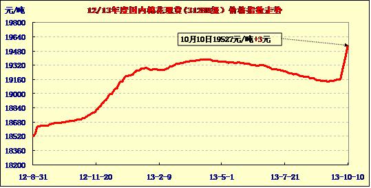 注:從10月8日起,棉花價格指數(shù)改為按新標準發(fā)布,由于新標準考查內(nèi)容較原來多且表示品種方式級內(nèi)在含義完全不同,故與原價格缺乏可比性,如從下表看,新標準下的近似原等級的價格高出250到300余元,這種比較顯然不符當前市場走勢,但由于新標準制訂時單方面考慮質(zhì)量本身,而忽略新舊標準的銜接比較,因此價格可比性意義不大。只新標準對新標準比,與原價格比較僅供參考。