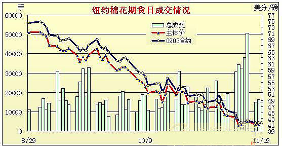 當(dāng)日開盤后,期棉價(jià)格受空頭回補(bǔ)的支持走強(qiáng),近期12月合約最高至41.72美分/磅,主力3月合約最高至42.96美分/磅。后外圍谷物市場(chǎng)及原油走弱,美國(guó)股市收跌,給期棉市場(chǎng)帶來壓力,同時(shí)買盤跟進(jìn)不足,盤終除12月合約外多數(shù)合約以小跌收?qǐng)觥?2月合約漲142點(diǎn),收于40.81美分/磅;3月合約跌6點(diǎn),收于41.78美分/磅。 紐約棉花期貨主力0903合約近三個(gè)交易日交易走勢(shì)