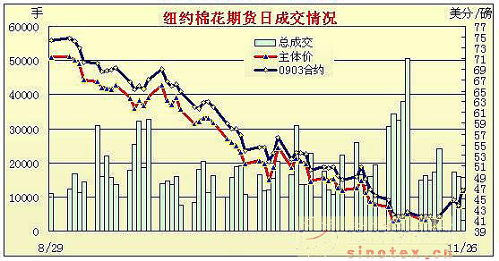 26日紐約期棉獲假日前買盤支持,大幅收高,多數(shù)合約漲幅超過200點(diǎn),近期12月合約漲幅達(dá)378點(diǎn)。當(dāng)日期棉市場高開高走,受假日前買盤支持及外圍市場帶動(dòng),午盤時(shí)棉價(jià)大幅走高,12月合約最高至45.31美分/磅,3月合約至46.63美分/磅,盤終各合約大幅收高,12月合約漲378點(diǎn),收于46.15美分/磅,3月合約漲280點(diǎn),收于46.55美分/磅。當(dāng)日原油期貨收高3.67美元,至54.38美元;大豆收高3美分,至8.86美元。 |