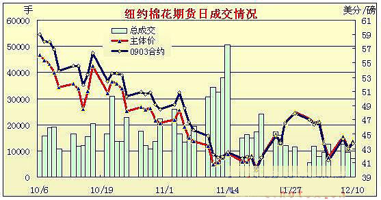 12月10日,美國國會和白宮對汽車救助達成原則一致意見,利好美國股市和商品市場,原油和谷物上揚兼美元走弱刺激期棉大幅攀升,尾盤隨股市滑落而抹去大多漲幅,盤終3月合約漲72點收于43.67美分。 當日紐約期棉小幅高開,受助于外圍上揚態(tài)勢,部分空頭回補,同時賣盤壓力較輕,期棉快速上沖,3月合約最高上揚至44.99美分,漲幅高達204點;臨近尾盤,股市漲幅削減,期棉快速回調(diào),大半漲幅被抹去,盤終各合約均保持上揚,雖漲幅不大。觀望氣氛依然濃厚,不過市場成交比前日略現(xiàn)活躍。 美國白宮周三表示,布什政府和國會領袖就拯救受困的美國汽車制造商計劃已經(jīng)達成一項“良好的概念性協(xié)議”,對股市和市場起到一定的提振;同時美國11月份聯(lián)邦預算赤字已經(jīng)高達1644億美元,為11月份赤字高位,其原因主要為救助計劃,此消息對美元有一定的壓力,美元全天較弱。而原油則反彈欲望較強,保持強勢上揚態(tài)勢。 紐約棉花期貨首期0903合約近三個交易日交易走勢