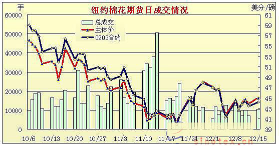 12月15日,市場對美聯(lián)儲降息寄予較大希望,美元延續(xù)大跌態(tài)勢,刺激商品市場反彈;但由于市場對原油之供需深表憂慮,因此早盤階段大幅攀升的原油隨后轉(zhuǎn)為跌勢;期棉削減漲勢,盤終依然維持上漲,但成交量再度減少 當(dāng)日紐約期棉高開,外圍商品均強勢上揚,尤其玉米和小麥由于上周末預(yù)測面積之減少而呈現(xiàn)大幅飆升態(tài)勢,而美元繼續(xù)大幅走弱,刺激期棉走高,3月合約最高漲至44.80美分,但原油轉(zhuǎn)而走跌,美股低位運行,促使大多商品市場漲幅回落,期棉也從高位滑落,但盤終各合約基本維持中幅上揚,3月合約漲73點收于44.16美分,由于臨近假期,兼市場前景不明,成交量并未尾隨價格上揚而放大,成交僅7900手。 美元指數(shù)上周直線回落,而本周一盤中跌破82,刺激商品市場上揚;原油由于市場對歐佩克和其它主產(chǎn)油是否可以如期削減產(chǎn)量存在擔(dān)憂,紐約一月原油期貨跌1.83美元,收于45美元以下,而盤中最高沖破50美元;玉米和小麥漲幅較大,均超過15%。 紐約棉花期貨首期0903合約近三個交易日交易走勢