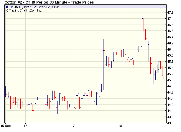 12月18日,美元超跌反彈,原油大跌收于四年半新低,盤(pán)中跌破36美元;美棉出口周報(bào)顯示上周美棉簽約和裝運(yùn)均處于低位;獲利平倉(cāng)和外圍壓力致使期棉回落,盤(pán)終各合約中幅收低。 當(dāng)日紐約期棉微弱低開(kāi),小幅震蕩后期棉3月合約漲至日內(nèi)高點(diǎn)47.14美分,但出口不濟(jì),資金獲利回吐,買(mǎi)盤(pán)衰竭,兼外圍弱勢(shì)打壓期棉回落,并觸發(fā)止損賣(mài)盤(pán),期棉快速打壓至45.50以下,其后獲得部分支撐,盤(pán)終3月合約跌68點(diǎn)收于45.28美分,其它合約也中幅下挫。 12.5-12.11日美國(guó)凈簽約出口本年度陸地棉17713噸,較前一周減29%;裝運(yùn)40460噸,為本年度最低。市場(chǎng)對(duì)經(jīng)濟(jì)的憂(yōu)慮再度升溫,原油18日暴跌近10%,逼近36美元,為四年半新低價(jià)位;而COMEX銅期貨也觸及四年新低,倫銅跌破3000。 紐約棉花期貨首期0903合約近三個(gè)交易日交易走勢(shì) |
