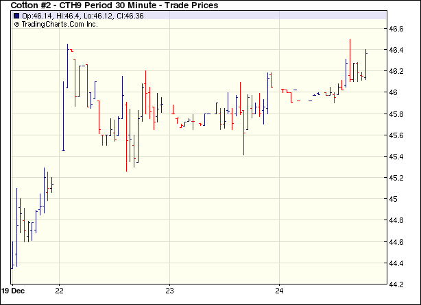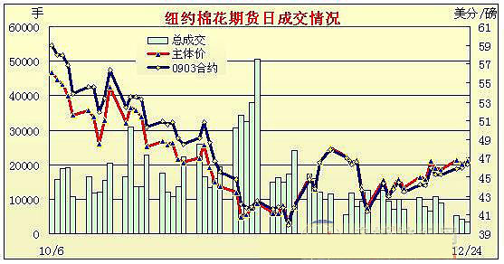 12月24日為節(jié)前最后一個(gè)交易日,交易時(shí)間縮短,美元走軟,為農(nóng)產(chǎn)品走強(qiáng)提供支撐,但原油大跌逾9%,紐約期棉交投稀疏,繼續(xù)小幅揚(yáng)升,盤終部分合約收平,其它合約小漲30點(diǎn)左右。 當(dāng)日期棉平開,延續(xù)近期走勢(shì),窄幅區(qū)間內(nèi)波動(dòng),3月合約波動(dòng)區(qū)間僅為45.90-46.50之間,受少量技術(shù)性買盤推動(dòng),3月合約和其它近期合約小幅上揚(yáng),其它大多合約收平,同時(shí)部分交易商已經(jīng)休假,交投大幅萎縮,僅為1400手。 12月24日公布的經(jīng)濟(jì)數(shù)據(jù)依然不樂(lè)觀,美國(guó)11月個(gè)人消費(fèi)支出物價(jià)指數(shù)較前月下降1.1%;而上周失業(yè)申請(qǐng)救助資金人數(shù)也小幅攀升;美元小幅走弱,美國(guó)2月主力原油合約24日大跌9%,盤中逼近35美元。 紐約棉花期貨首期0903合約近三個(gè)交易日交易走勢(shì) |