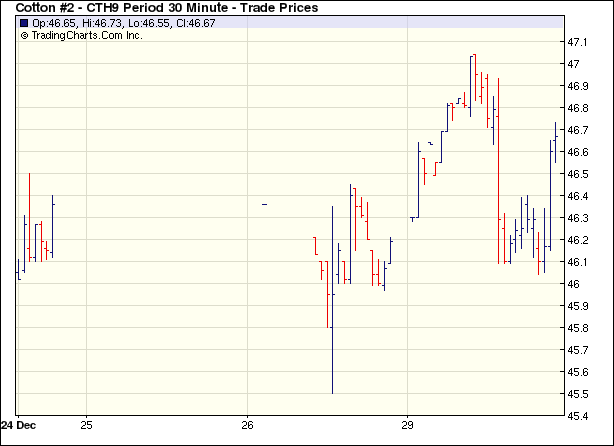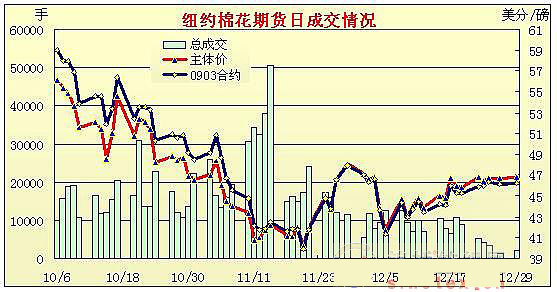 12月29日,圣誕節(jié)假期過(guò)去,年終來(lái)臨,市場(chǎng)依然交投不旺,紐約期棉在外圍市場(chǎng)主導(dǎo)下窄幅波動(dòng),盤終除近期合約上揚(yáng)7點(diǎn)外,其一合約均小幅收跌。 當(dāng)日紐約期棉小幅高開(kāi),美元走跌,而原油反彈,助推商品期貨電子盤大幅走高,期棉受助上揚(yáng),3月合約上漲至高點(diǎn)47.04美分,其后,芝加哥商品期貨大幅走低,同時(shí)美元轉(zhuǎn)而走強(qiáng),令期棉虛高的價(jià)格快速回落至平盤價(jià)位,盤終近期3月合約漲7點(diǎn)收于46.25美分,5月合約跌21點(diǎn)收于46.60美分。節(jié)假日氣氛尚未消退,交易商依然觀望,成交繼續(xù)維持低迷。 紐約棉花期貨首期0903合約近三個(gè)交易日交易走勢(shì) |