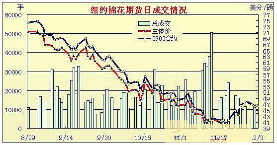 10月3日,美國(guó)股市和美元延續(xù)反彈;而原油表現(xiàn)依然疲弱,高位慢慢滑落;谷物低位震蕩,受持續(xù)買(mǎi)盤(pán)帶動(dòng),期棉由下跌轉(zhuǎn)為快速上揚(yáng),但隨股市回落再度縮窄漲幅至微弱漲勢(shì)收盤(pán),終陷區(qū)間震蕩,3月合約漲27點(diǎn)收于46.60美分。 當(dāng)日紐約期棉低開(kāi),電子盤(pán)階段小幅走弱,3月合約下探至45.72美分,但其后隨美國(guó)股市強(qiáng)勁上揚(yáng),持續(xù)買(mǎi)盤(pán)快速拉高3月合約,最高沖至47.49美分,漲幅過(guò)百點(diǎn),但其后隨美股的下挫,期棉高位并未企穩(wěn),漲幅縮減,最后各合約保持微弱漲勢(shì)收盤(pán)。 近期期棉走勢(shì)明顯為區(qū)間震蕩,漲跌均不大,市場(chǎng)等候方向指引。USDA12月份的全球供需報(bào)告將于下周公布;另外將于明日公布的最新出口和近期的經(jīng)濟(jì)數(shù)據(jù)都對(duì)期棉走勢(shì)有所影響。 紐約棉花期貨主力0903合約近三個(gè)交易日交易走勢(shì)