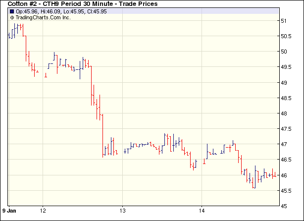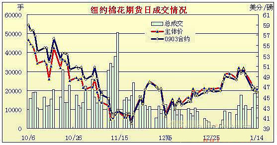 1月14日紐約期棉走勢繼續(xù)受外圍市場指引,在少量賣盤打壓下小幅收低,這已是連續(xù)四個交易日向下調(diào)整。當日市場小幅高開,午盤前震蕩走高,3月合約最高至47.11美分/磅。受美國股市及原油價格頹勢影響,午盤后市場中涌現(xiàn)投機賣盤,期棉走低,抵消之前的漲幅并小幅收低。3月合約跌23點,收于46.00美分/磅;5月合約跌19點,收于46.90美分/磅。 根據(jù)美國商務部最新公布數(shù)據(jù),美國2008年12月零售總額下降了2.7%,這是去年10月下降3.4%以來的最大降幅。較分析師前期預測的下跌幅度增加約1倍。有分析師指出,這個數(shù)據(jù)對棉花價格上漲帶來阻力;但除非外圍商品市場或棉花基本面出現(xiàn)巨大變化,否則棉價也不會出現(xiàn)大幅的下跌。目前市場仍受下年度棉花面積看減的支持。 紐約棉花期貨首期0903合約近三個交易日交易走勢 |