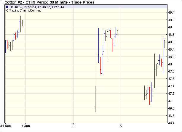1月5日紐約期棉交投活躍,由于基金賣盤和獲利回吐的打壓,各合約小幅收跌。當(dāng)日市場低開低走,早盤美元走強對商品市場形成壓力,棉花也受迫大幅走低,由于基金賣盤和獲利回吐的打壓,主力3月合約最低至46.90美分/磅,較開盤低118點。后外圍市場部分商品價格走高,助期棉價格反彈,收回部分跌幅。盤終各約合小幅收跌,3月合約跌60點,收于48.31美分/磅;5月合約跌56點,收于48.72美分/磅。 紐約棉花期貨首期0903合約近三個交易日交易走勢 |