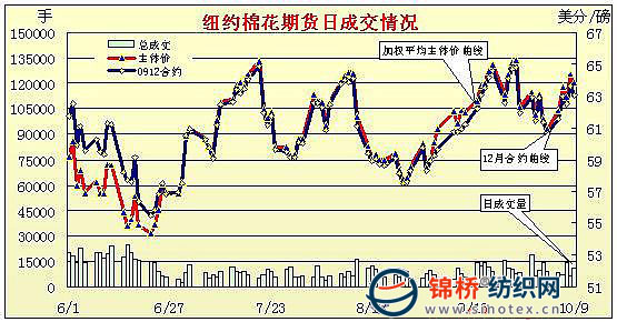 10月9日,美元有所走強(qiáng),對(duì)于大宗商品帶來(lái)壓力,期棉小幅震蕩,盤(pán)終近期12月合約小幅下跌63點(diǎn)。當(dāng)日紐約期棉基本平開(kāi),窄幅區(qū)間波動(dòng),美元走強(qiáng)為期棉帶來(lái)壓力,致使期棉回落,但地位得到買(mǎi)盤(pán)支撐,12月合約再度回升,USDA報(bào)告出爐,調(diào)降美國(guó)產(chǎn)量,符合市場(chǎng)預(yù)期,但這一利好已經(jīng)基本為市場(chǎng)所消化,所以對(duì)于期棉基本沒(méi)有實(shí)際的利好影響;午盤(pán)后,投機(jī)賣(mài)盤(pán)再度施壓,促使期棉回落,直至收盤(pán)。 紐約棉花期貨首期0912合約近三個(gè)交易日交易走勢(shì) |