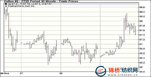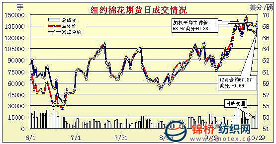 10月29日,美國(guó)公布的第三季度GDP增速超過(guò)預(yù)期,是近2年來(lái)最高增速,為市場(chǎng)帶來(lái)一線希望,作為避險(xiǎn)之功能的美元終于低頭回落,大宗商品市場(chǎng)迎來(lái)“翻身”機(jī)會(huì),兼美棉出口較前有所回升,促使期棉隨外圍行情大幅上揚(yáng),盤終各份合約均強(qiáng)勢(shì)回升,同時(shí)交投放量,展倉(cāng)活躍。當(dāng)日隨著美元走軟,大宗商品市場(chǎng)(原油、大豆和黃金等)全面止跌回升,兼技術(shù)買盤支撐推動(dòng)期棉走高,12月合約在67.25和67.55美分處連續(xù)觸發(fā)止損買盤,期棉快速反彈,12月合約竄至68.24美分的高位,其后漲勢(shì)回落,但盤終大部分合約漲幅在100點(diǎn)左右。同時(shí)市場(chǎng)展倉(cāng)交投活躍,占成交量的一半,當(dāng)日成交約2.5萬(wàn)手。 紐約棉花期貨首期0912合約近三個(gè)交易日交易走勢(shì) |