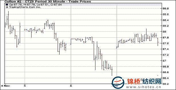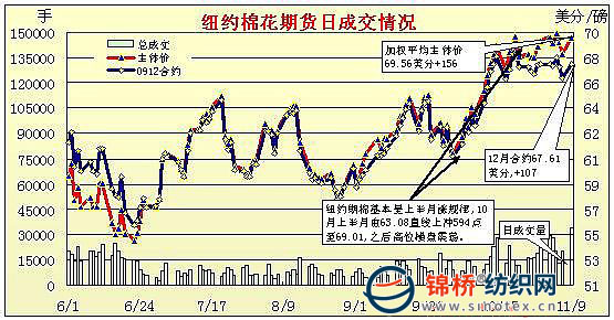 11月9日美元跌至近14個月低點,促進商品市場普漲,紐約期棉隨外圍市場共同走高,前4個合約漲幅超過百點;近期12月合約收于67.61美分/磅,漲107點;3月合約收于71.45美分/磅,漲112點。當日期棉小幅高開后穩(wěn)步攀升,美元走低,跌至近14個月來低點吸引買家,谷物、原油和黃金期貨紛紛走高,ICE期棉受投機買盤及貿易買盤支持大幅上漲,主力12月合約最高至68.10美分/磅。盤終前4個合約漲幅過百,為105-113點;遠期合約漲幅相對較小,為48-86點。距離12月合約第一交割通知日還剩9個交易日,該合約持倉正逐漸減少,隨著轉倉持續(xù),3月合約將很快代替12月合約成為主力合約。 紐約棉花期貨首期0912合約近三個交易日交易走勢 |
