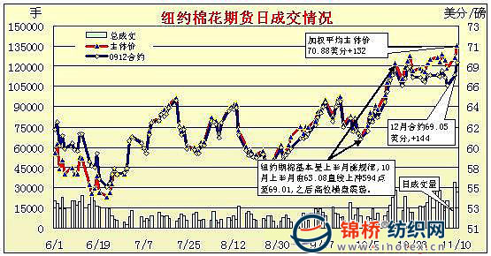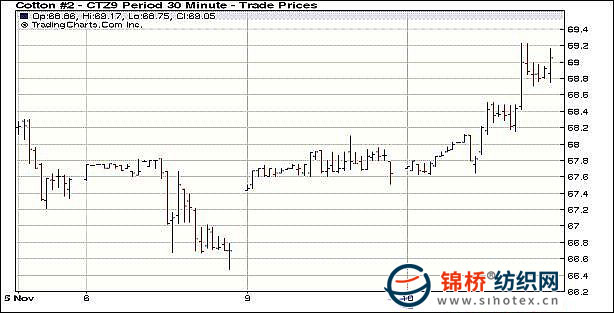 11月10日美國(guó)農(nóng)業(yè)部(USDA)最新供需報(bào)告利多,紐約期棉受支撐強(qiáng)勢(shì)上漲且成交放量。當(dāng)日近期12月合約收于69.05美分/磅,漲144點(diǎn),為08年10月3日(69.76美分/磅)以來(lái)最高點(diǎn);3月合約收于72.84美分/磅,漲139點(diǎn)。當(dāng)日期棉市場(chǎng)平開(kāi)高走,由于USDA最新供求預(yù)測(cè)調(diào)減美國(guó)及全球棉花產(chǎn)量,同時(shí)調(diào)高全球消費(fèi)量,因此對(duì)期棉形成有力支撐。在買(mǎi)盤(pán)支持下期棉走高,且盤(pán)中觸發(fā)止損買(mǎi)盤(pán),進(jìn)一步助漲價(jià)格,12月合約最高至69.23美分/磅。最終各合約收漲123-148點(diǎn)。 紐約棉花期貨首期0912合約近三個(gè)交易日交易走勢(shì) |