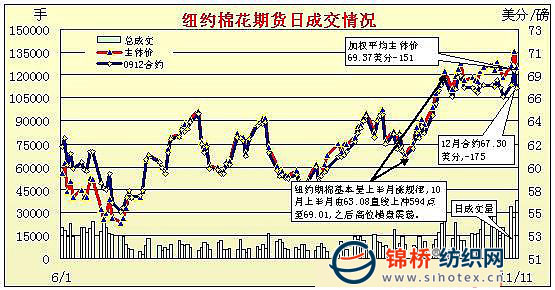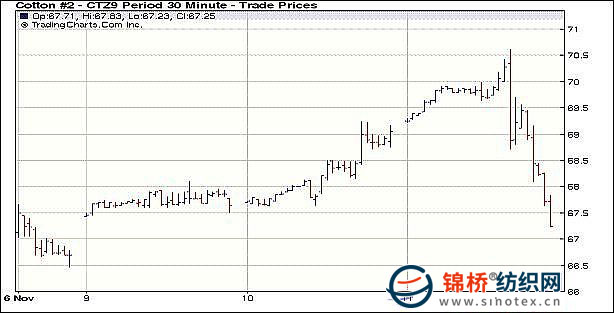 11月11日美元先抑后揚,紐約期棉受此影響先沖高后回落,各合約大幅收跌;近期12月合于收于67.30美分/磅,跌175點;3月合約收于71.08美分/磅,跌176點。當日成交繼續(xù)放量,約4.8萬手,較前一日增加約1萬手。當日期棉高開高走,由于美元盤中走弱,接近15個月來低點,因此期棉隨外圍市場一起走強,在投機及貿(mào)易買盤支持下12月合約最高至70.61美分/磅,為該合約13個月以來最高點。之后美元反彈,期棉受到賣盤打壓,加之看跌期權(quán)買盤活躍,棉價從高點回落,一路下滑,盤終各合約跌幅均在160點以上。 紐約棉花期貨首期0912合約近三個交易日交易走勢 |