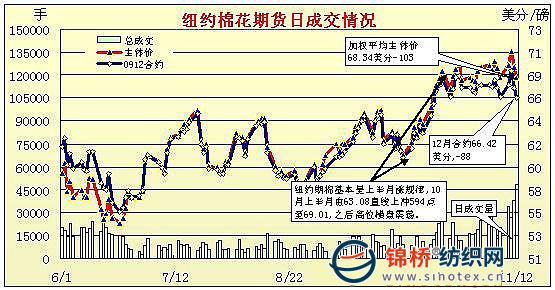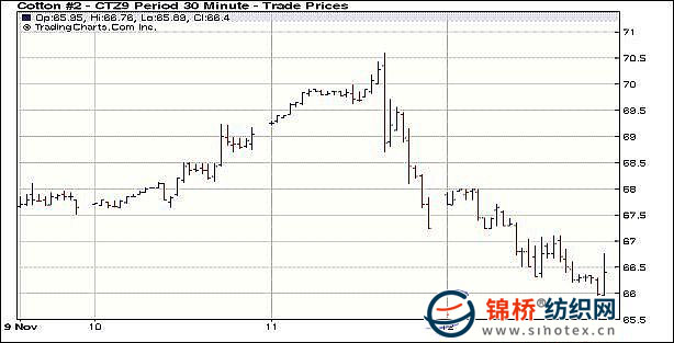 11月12日紐約期棉中幅下跌,近期12月合約收于66.42美分/磅,跌88點,1003月合約收于70.31美分/磅,跌77點;市場總成交量暴增。當日市場大幅下跌,12日開盤延續(xù)弱勢。獲利了結投機性賣盤和美元反彈迫使整個商品市場下跌,給期棉市場帶來壓力,另外,前一日大跌令技術面承壓,12月合約盤中跌破66美分關鍵支撐位,最低至65.87美分/磅,最終以中幅下跌收盤。 紐約棉花期貨首期0912合約近三個交易日交易走勢 |