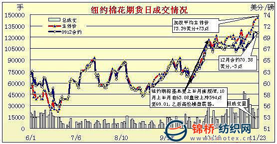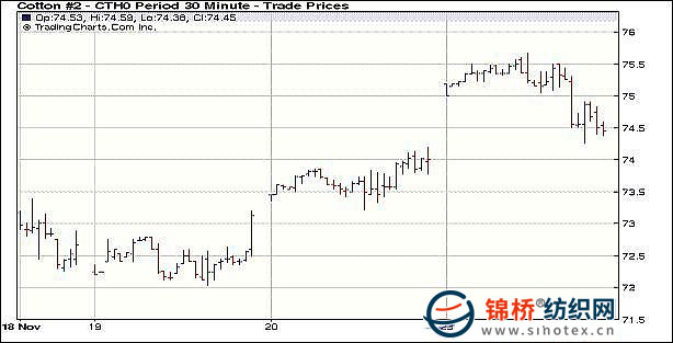 11月23日,美元再度大幅下挫,大宗商品上揚,兼中國鄭州棉花期貨漲停影響,紐約期棉早盤沖高,但午盤后回落,盤終近期12月合約微跌3點,主力3月合約漲44點,其它大多合約小幅收跌。當日紐約期棉早盤高開,早盤繼續(xù)保持強勢,主要受美元下跌,以及中國期棉飆漲的影響,期棉沖擊17個月來的新高,12月合約最高到72美分,3月合約沖破75美分,最高75.67美分;午盤后漲勢回落,同時期棉成交較前幾日有所縮量。