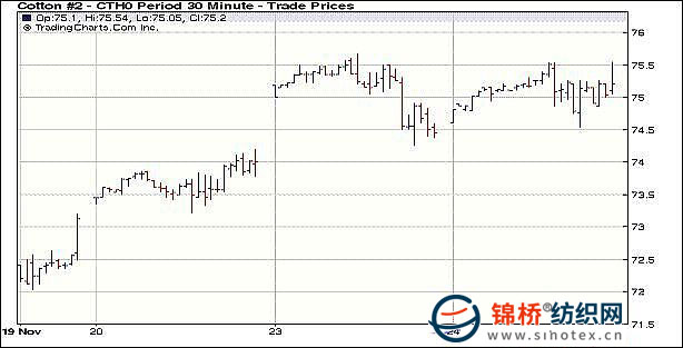 11月24日,由于對經(jīng)濟復蘇信心增強,但憂慮就業(yè)市場,對市場產(chǎn)生些許影響。美國股市低位震蕩,商品市場偏弱,但在外圍走勢偏空的背景下,紐約期棉再度收高百點,強勢顯現(xiàn)。盤終主力3月合約漲104點收于75.52美分,此時已是連續(xù)第五日上漲。當日紐約期棉小幅高開,但在外圍壓力下買盤力道似有衰竭,期棉從高位滑落,然而,尾盤再度強勢走高,大幅收漲,市場分析認為中國棉花市場的強勢連續(xù)兩日收于漲停,12月合約沒有交割量,而紡企的近期需求迫切是推動棉花走高的主要原因,因此雖然感恩節(jié)假期臨近,成交不太旺盛,同時外圍走弱,但紐約期棉依然強勢攀高,不過成交量已經(jīng)較早大幅下滑。 紐約棉花期貨主力1003合約近三個交易日交易走勢 |