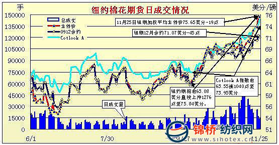 11月25日,美元指數(shù)再度暴跌,進而刺激外圍商品市場普遍大幅上揚。然而,感恩節(jié)前夕,紐約期棉交投卻冷靜,并未跟隨上揚,小幅回落,同時交投繼續(xù)縮量,盤終3月合約小跌30點收于75.22美分。當(dāng)日期棉早盤交投平靜,10月份美棉消費小幅增加,支撐早盤期棉有所爬升,但感恩節(jié)前,交投整體平靜,高位少量獲利多單平倉,打壓期棉小幅走低,近期12月合約僅僅發(fā)布130份交割通知單,但美元的暴跌,推動外圍商品市場大幅暴漲,不過期棉并未尾隨,同時中國棉花協(xié)會小幅調(diào)高產(chǎn)量預(yù)期也對ICE期棉構(gòu)成利空打壓。數(shù)個因素集體影響,ICE期棉整體表現(xiàn)為震蕩調(diào)整,小幅修正漲幅。 紐約棉花期貨主力1003合約近三個交易日交易走勢 |