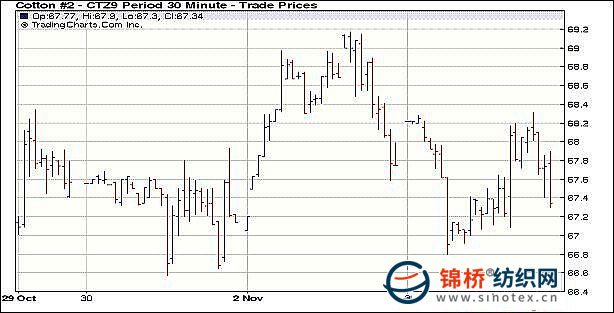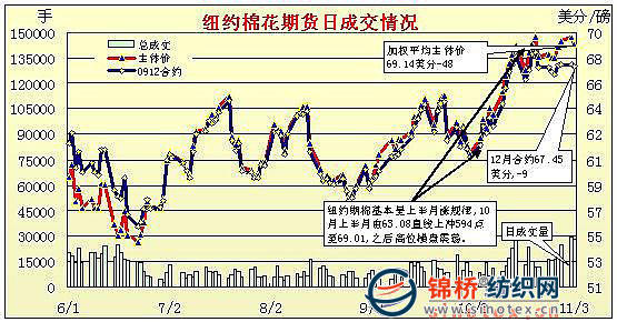 11月3日外圍市場(chǎng)繼續(xù)影響,紐約期棉缺乏買(mǎi)盤(pán)的支持,棉市小幅收陰,成交量有所回落。受美元走強(qiáng)及外圍商品市場(chǎng)走弱的影響,昨日期棉早盤(pán)走弱。后原油和大豆期貨反彈,帶動(dòng)投機(jī)買(mǎi)盤(pán)支持期棉價(jià)格上漲,主力12月合約最高至68.31美分/磅。然而買(mǎi)盤(pán)后續(xù)力量不足,導(dǎo)致棉價(jià)從高點(diǎn)回落,且盤(pán)終小幅收跌。12月合約收于67.45美分/磅,跌19點(diǎn);3月合約收于70.82美分/磅,跌27點(diǎn)。 紐約棉花期貨首期0912合約近三個(gè)交易日交易走勢(shì) |