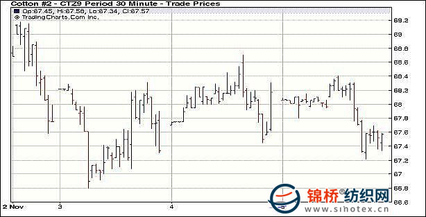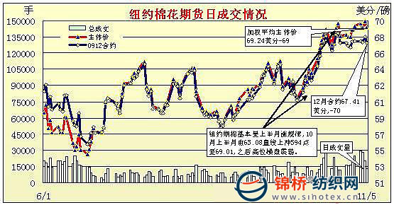 11月5日,由于外圍商品市場疲軟,紐約期棉中幅下跌,12月合約收于67.41美分/磅,跌70點(diǎn);3月合約收于70.99美分/磅,跌56點(diǎn);當(dāng)日成交量有所回升。當(dāng)日期棉市場小幅低開,窄幅震蕩,盤中一度小幅上揚(yáng),12月合約最高至68.41美分/磅。后因?yàn)橥鈬图肮任锸袌觯貏e是大豆期貨嚴(yán)重下挫,拖拽期棉弱勢下跌,12月合約最低至67.21美分/磅,最終大部分合約收跌,遠(yuǎn)月合約跌幅相對縮小。 紐約棉花期貨首期0912合約近三個交易日交易走勢 |