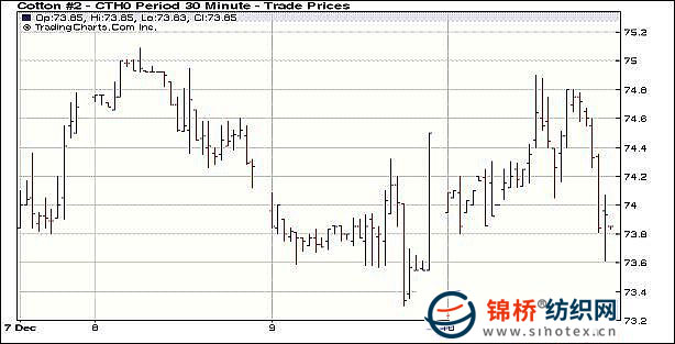12月10日,美國農(nóng)業(yè)部供需預(yù)測報(bào)告中大幅度調(diào)減了本年度全球棉花期末庫存,美棉庫存也相應(yīng)減少,但期棉并未受到足夠支撐。紐約期棉近期3月合約中幅下跌,結(jié)算價(jià)73.72美分/磅,跌70點(diǎn)。當(dāng)日期棉開盤穩(wěn)定,但盤中缺乏足夠買盤支持,市場未能表現(xiàn)出上漲態(tài)勢。原油和金屬期貨下跌,對(duì)期棉形成打壓。尾段隨有買盤試圖拉升,但當(dāng)3月合約最高上漲到74.90美分/磅后買盤未連續(xù)跟進(jìn),獲利了結(jié)賣盤促使市場高位下滑。 紐約棉花期貨首期1003合約近三個(gè)交易日交易走勢 |