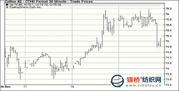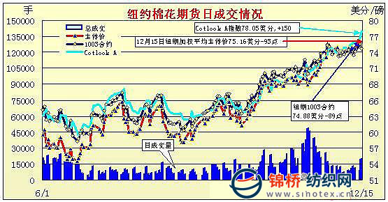 12月15日,市場(chǎng)憂慮美聯(lián)儲(chǔ)會(huì)逐步撤出其刺激政策因此推動(dòng)美元大幅走高,大宗商品回軟,紐約期棉早盤穩(wěn)定,但午盤后遭獲利平倉(cāng)盤打壓,盤終各合約跌百點(diǎn)。當(dāng)日紐約期棉早盤窄幅波動(dòng),并無(wú)趨勢(shì)性方向,且交投低迷,其中3月主力合約勉強(qiáng)突破前日高位,攀升至76.17美分的高位,外圍市場(chǎng)方面,原油在經(jīng)歷連續(xù)的下跌后有所反彈,但美元大幅走高,促使其它大宗商品市場(chǎng)紛紛走低,午盤后,獲利平倉(cāng)盤涌現(xiàn),兼看跌期權(quán)買盤打壓,促使期棉快速回落,盤終主力3月合約跌89點(diǎn)。成交較前日有所縮量。 紐約棉花期貨首期1003合約近三個(gè)交易日交易走勢(shì) |